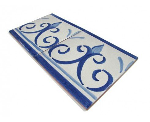 Azulejo pintado a mano usando la técnica de “sobre vidrio”, de 15×15 cm. con dibujo de cenefa referencia SV2103