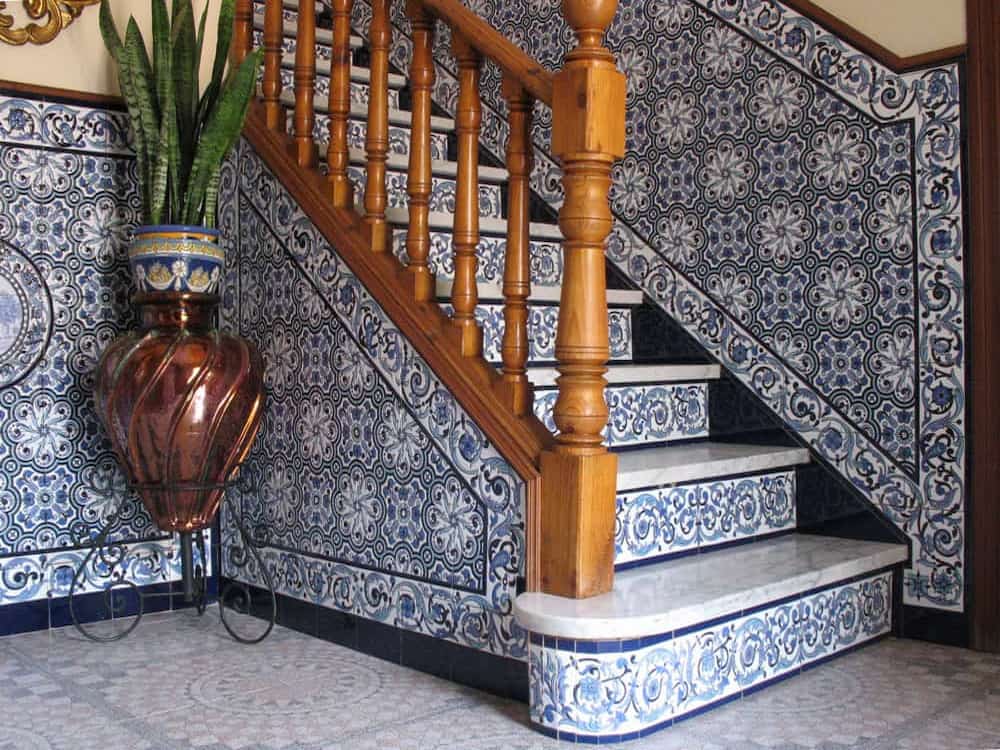 Escalera y zócalo diseñado a medida en azul y blanco (Sevilla)