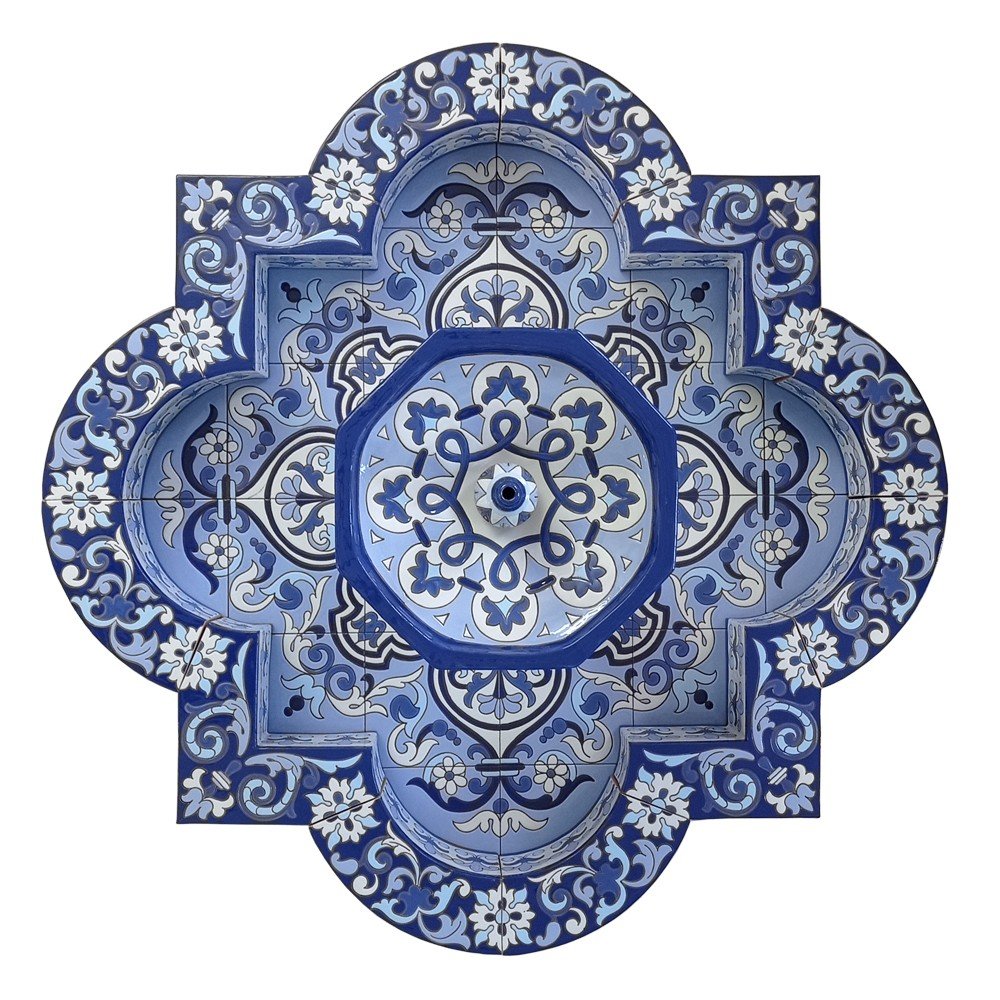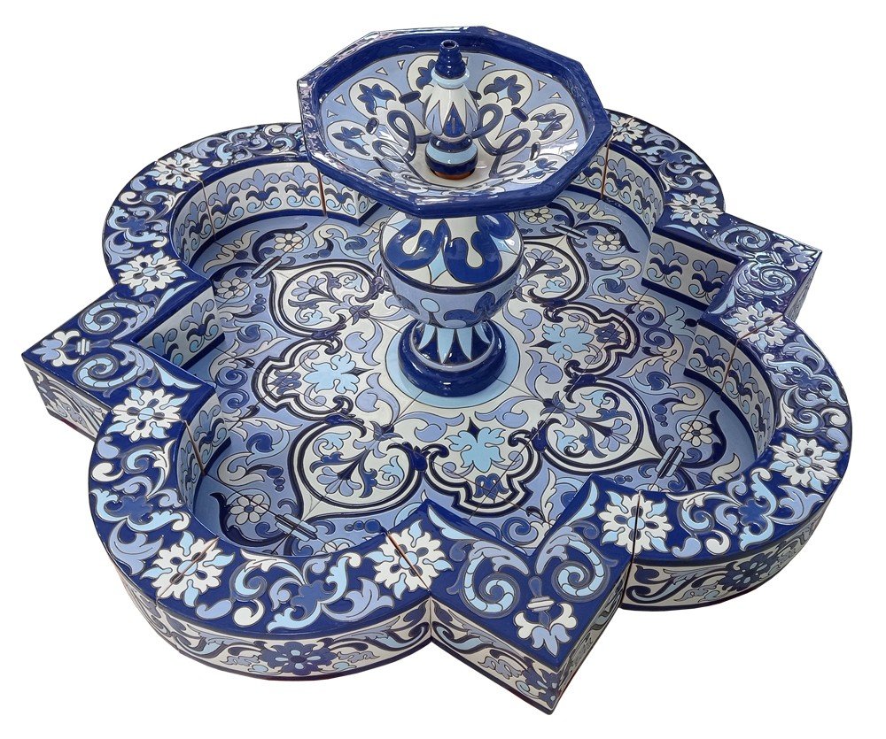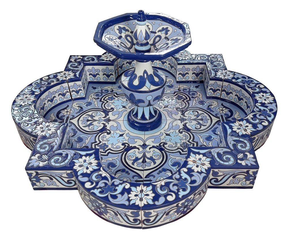 Fuente de cerámica pintada a mano para decoración de jardines o patios. Puede ser instalada tanto en interior como en exterior (salvo en zonas de heladas severas).