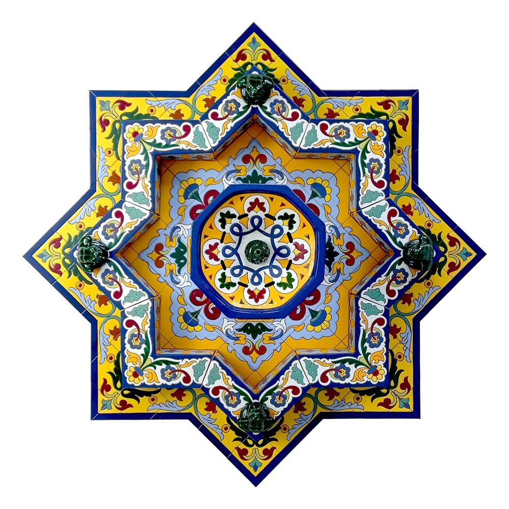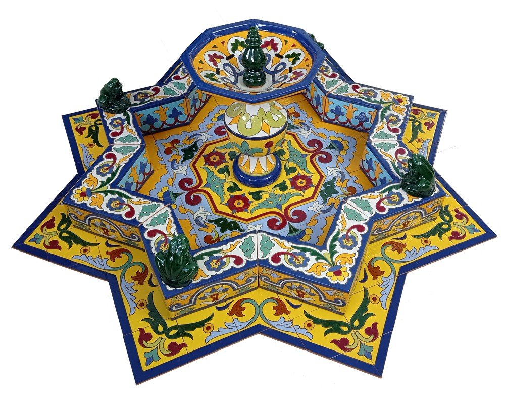 Fuente de cerámica pintada a mano para decoración de jardines o patios. Puede ser instalada tanto en interior como en exterior (salvo en zonas de heladas severas).