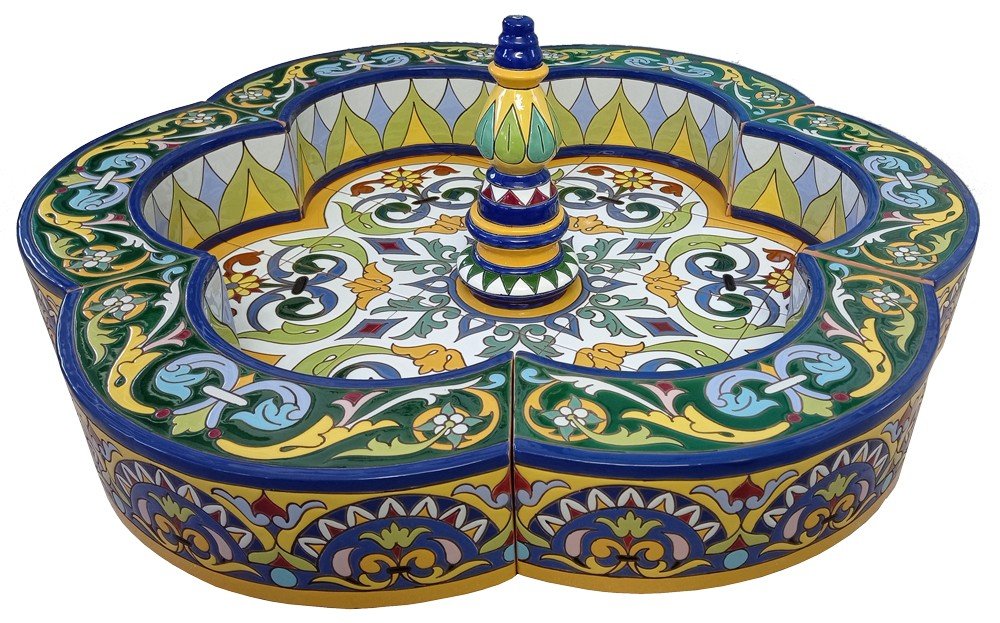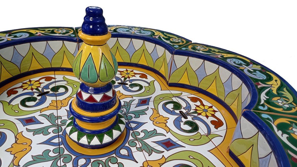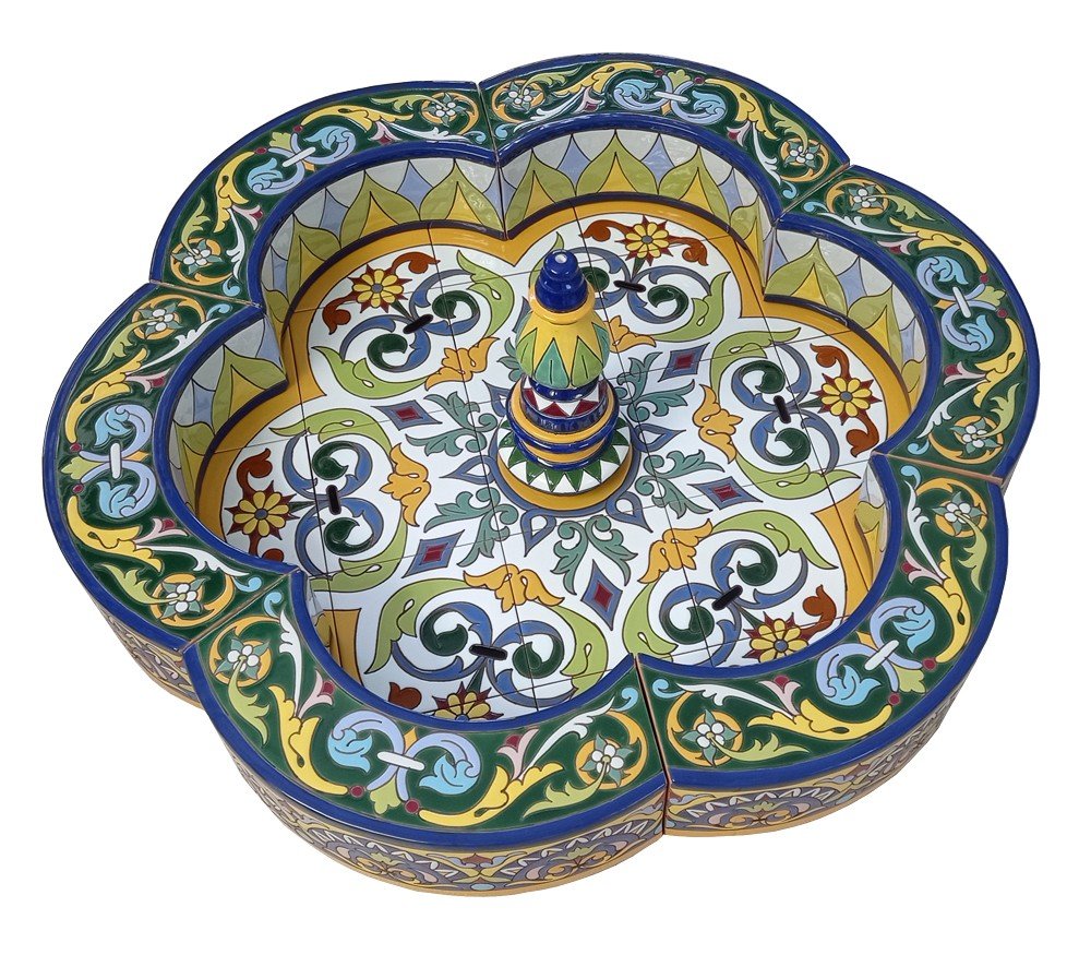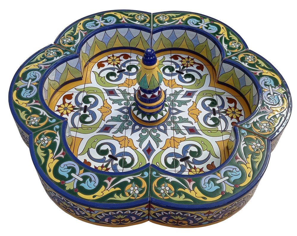 Fuente de cerámica pintada a mano para decoración de jardines o patios. Puede ser instalada tanto en interior como en exterior (salvo en zonas de heladas severas).