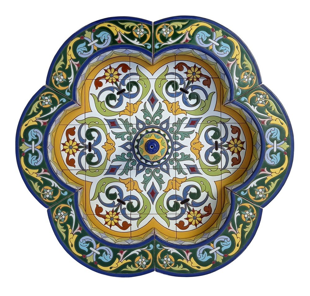 De estilo renacimiento, con un diseño refinado, está realizada en “cuerda seca”, una técnica que permite aportar un colorido y vistosidad únicos, y que habitualmente no se usa en este tipo de piezas dada su complejidad. En Cerámica Campos siempre hemos realizado nuestras fuentes de esta forma, y queremos conservar este proceder para el mantenimiento de la tradición de la cerámica de Triana.