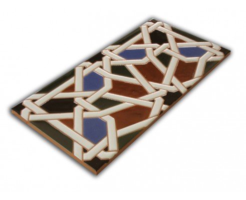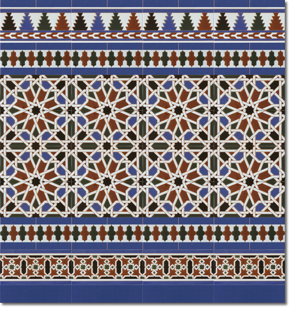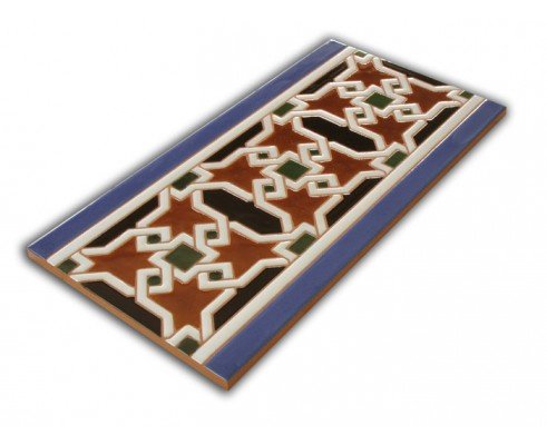 Zócalo de azulejos pintados a mano, de estilo árabe, con el diseño y colorido de los tradicionales zócalos de la arquitectura Mudéjar.