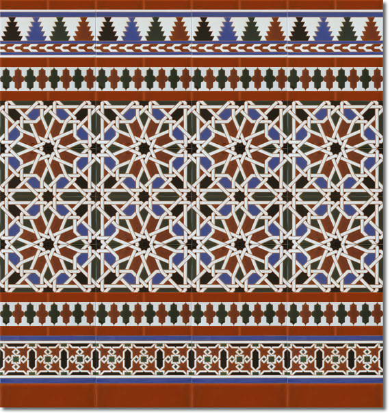 Zócalo de azulejos pintados a mano, de estilo árabe, con el diseño y colorido de los tradicionales zócalos de la arquitectura Mudéjar.