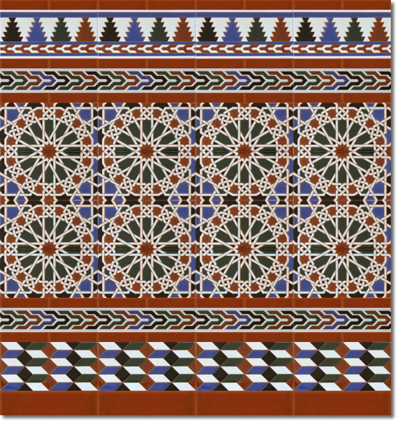 Zócalo de azulejos pintados a mano, de estilo árabe, con el diseño y colorido de los tradicionales zócalos de la arquitectura Mudéjar.